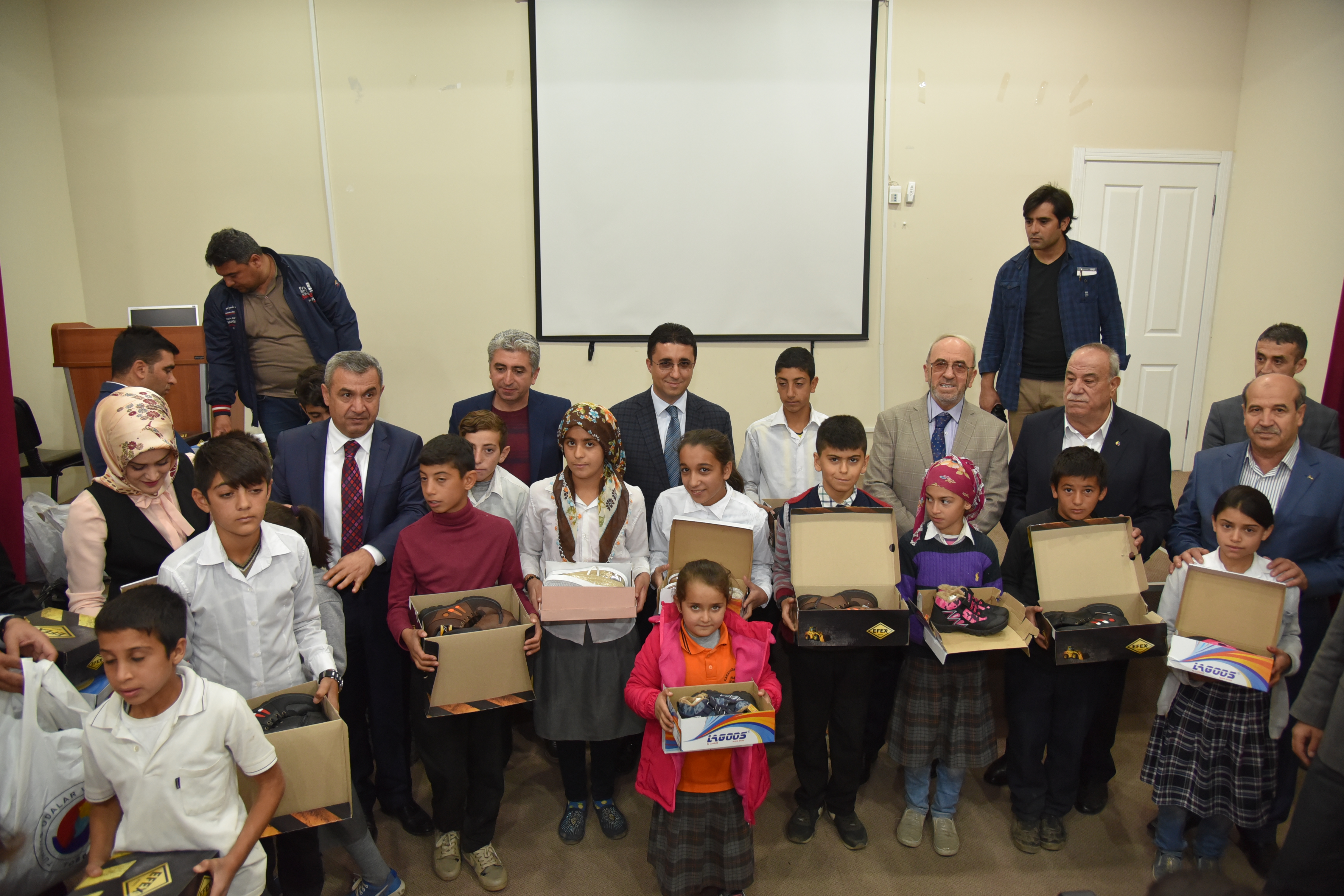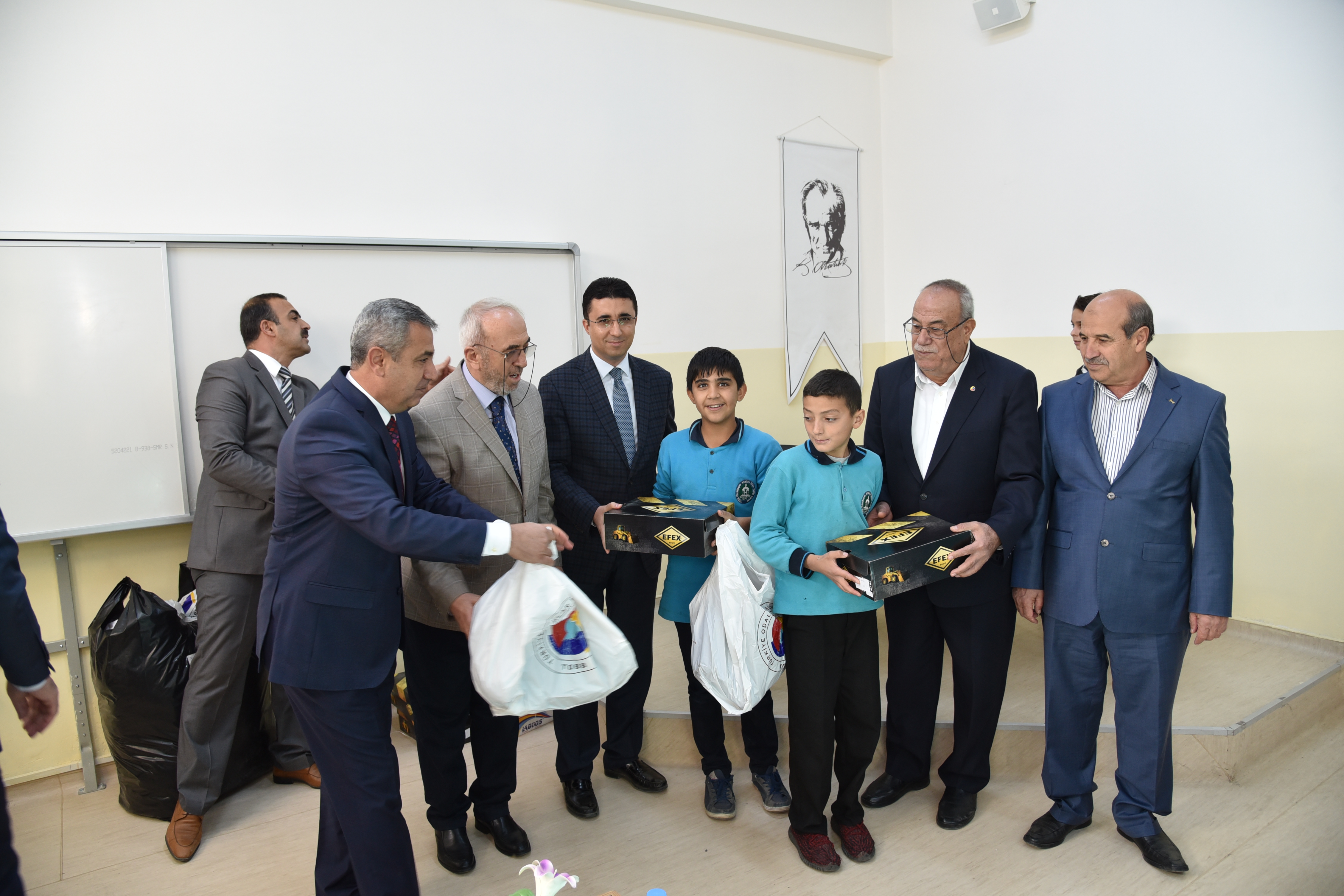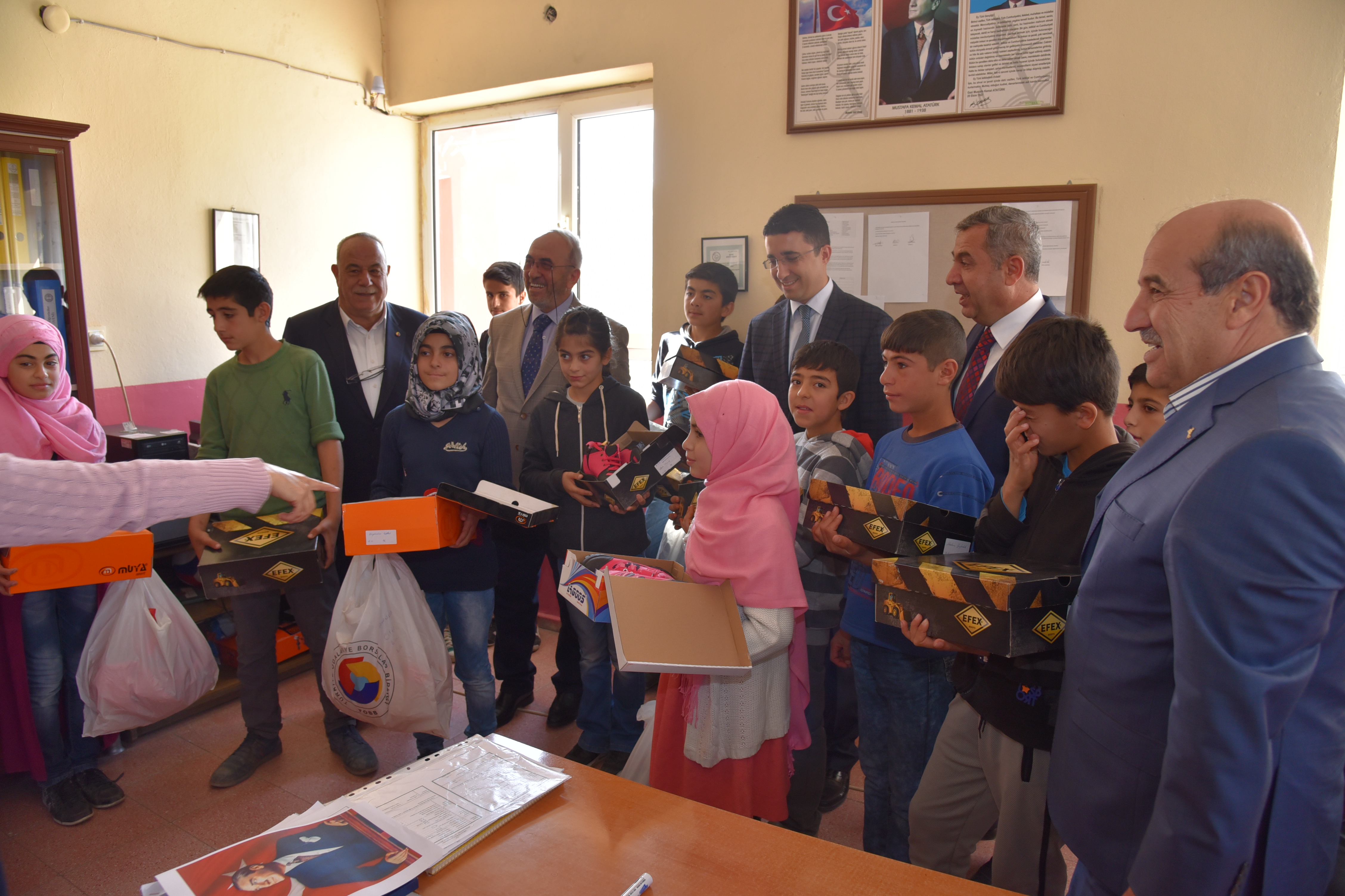 Elazığ Ticaret Borsası Başkanı Mehmet Ali Dumandağ ve Yönetim kurulu üyeleri ve Karakoçan Kaymakamı Mehmet Kocabey 'in de katılımları ile öğrencilere ayakkabı ve mont dağıtıldı.
